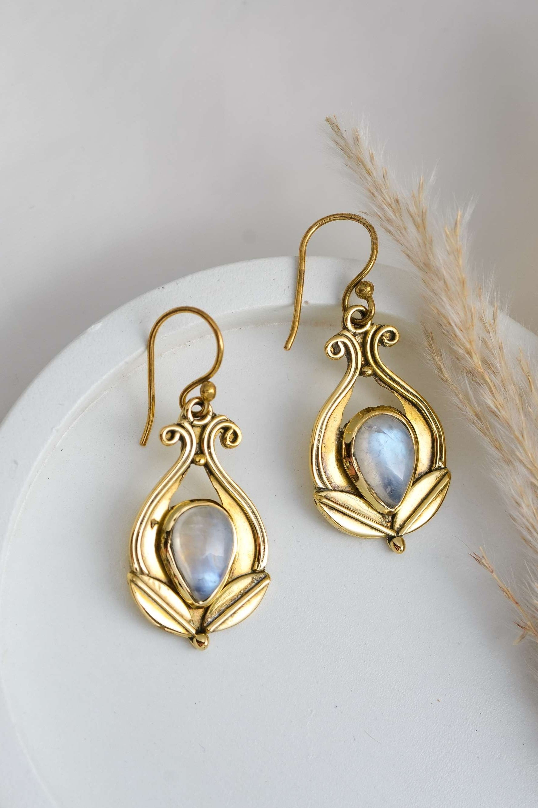 Beautiful Brass Earrings with a flower design and a gemstone