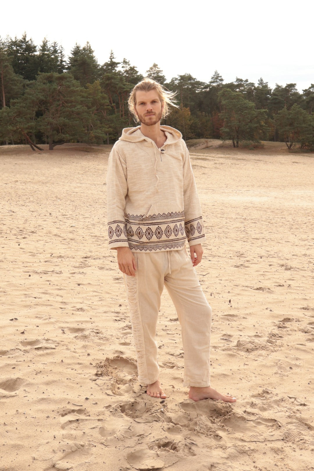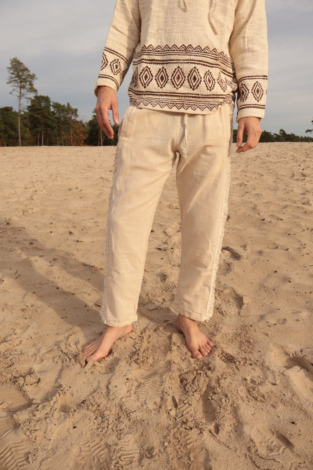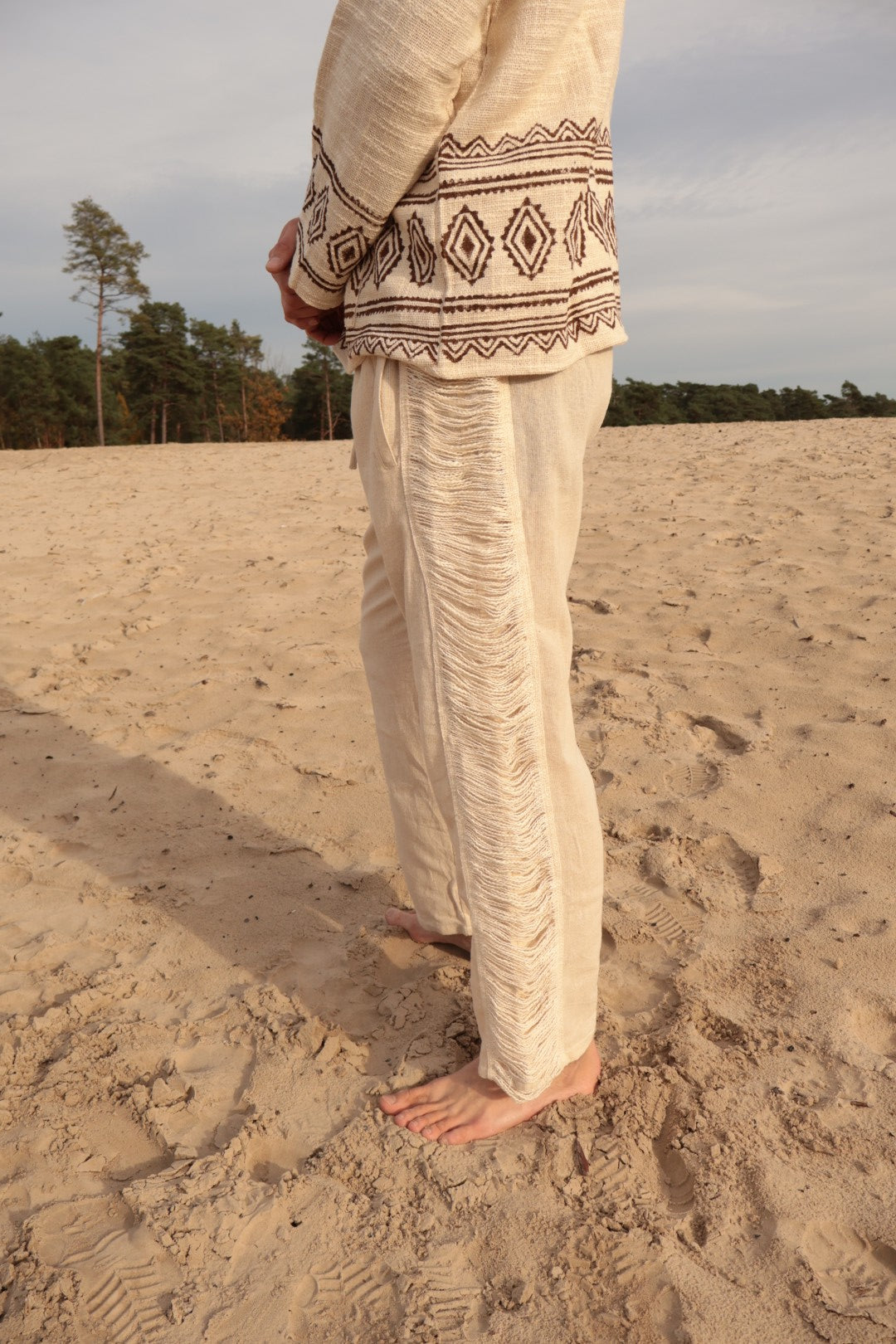 The Earth Dancer Pants are crafted for both ritual and everyday wear, blending comfort with ceremonial style. With a straight fit, these pants feature an open-weave strip of raw cotton along the sides, giving them a unique, earthy texture. The elastic waistband and drawstring allow for a perfect fit, while the natural look and feel of the fabric enhance their connection to the earth. Designed for movement and expression, these pants invite you to dance to your own rhythm.