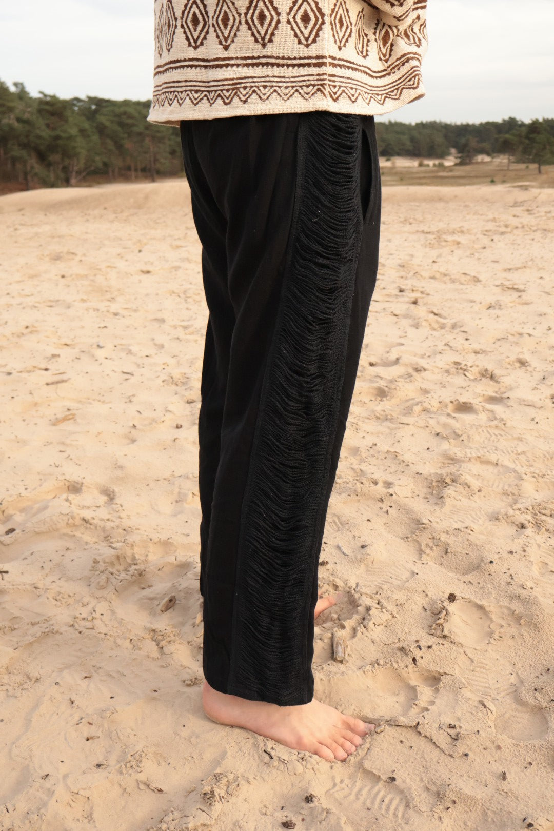 The Earth Dancer Pants are crafted for both ritual and everyday wear, blending comfort with ceremonial style. With a straight fit, these pants feature an open-weave strip of raw cotton along the sides, giving them a unique, earthy texture. The elastic waistband and drawstring allow for a perfect fit, while the natural look and feel of the fabric enhance their connection to the earth. Designed for movement and expression, these pants invite you to dance to your own rhythm.