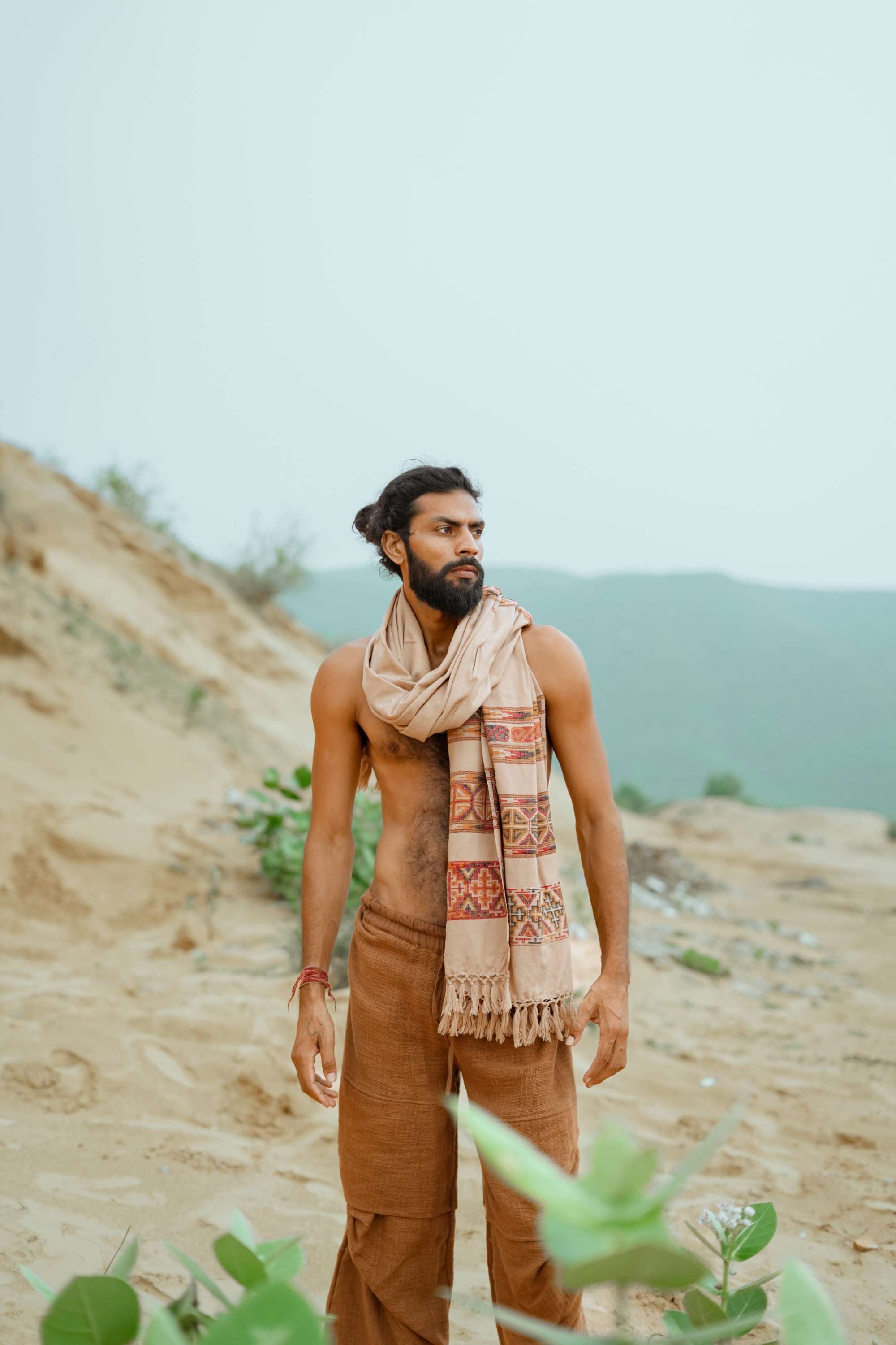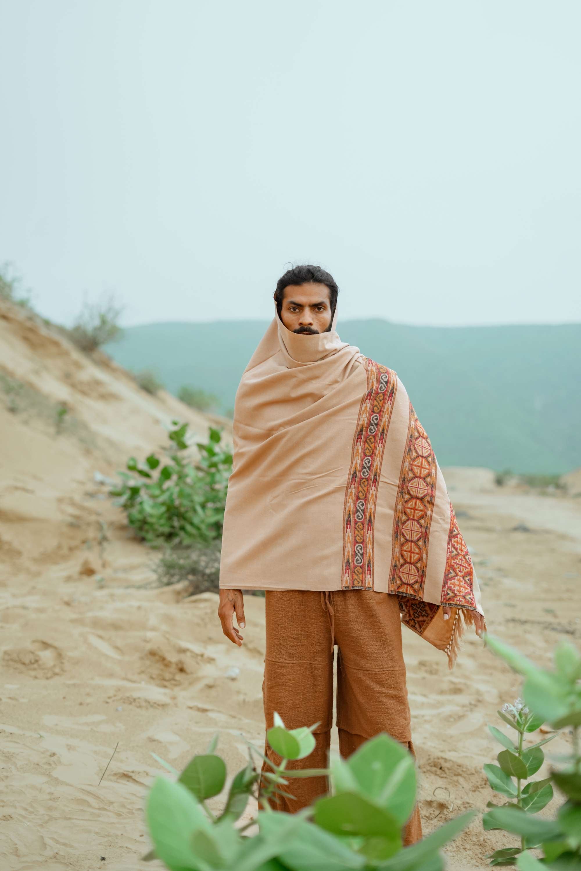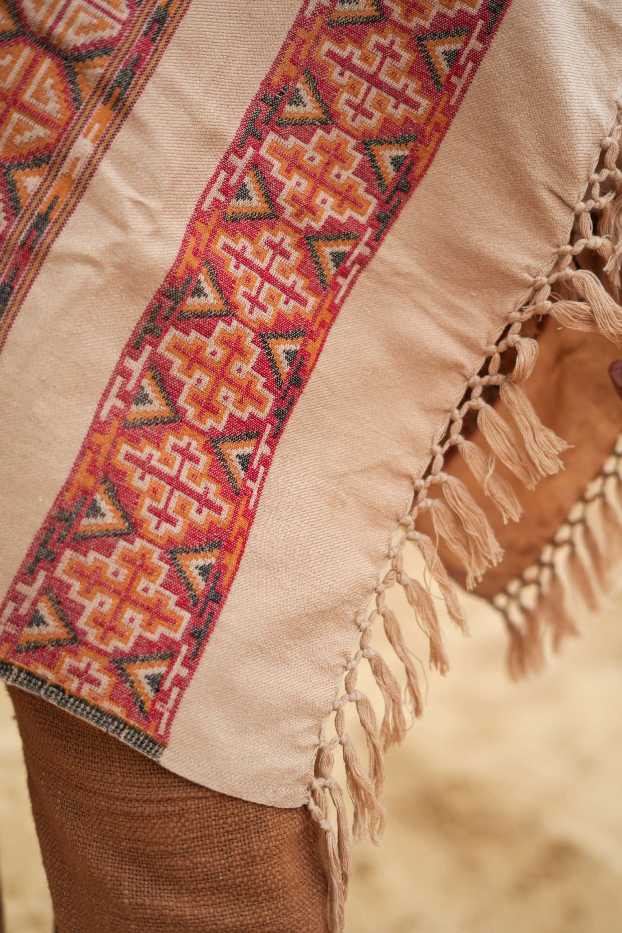 The Khullu shawl is a beautiful and practical wrap made from a blend of soft cotton and acrylic. The shawl is warm, comfortable, and gentle on the skin. The knitted border with geometric patterns gives the shawl a unique appearance. The shawl is large enough to keep you warm on cold days and can also be used as a scarf or headscarf.