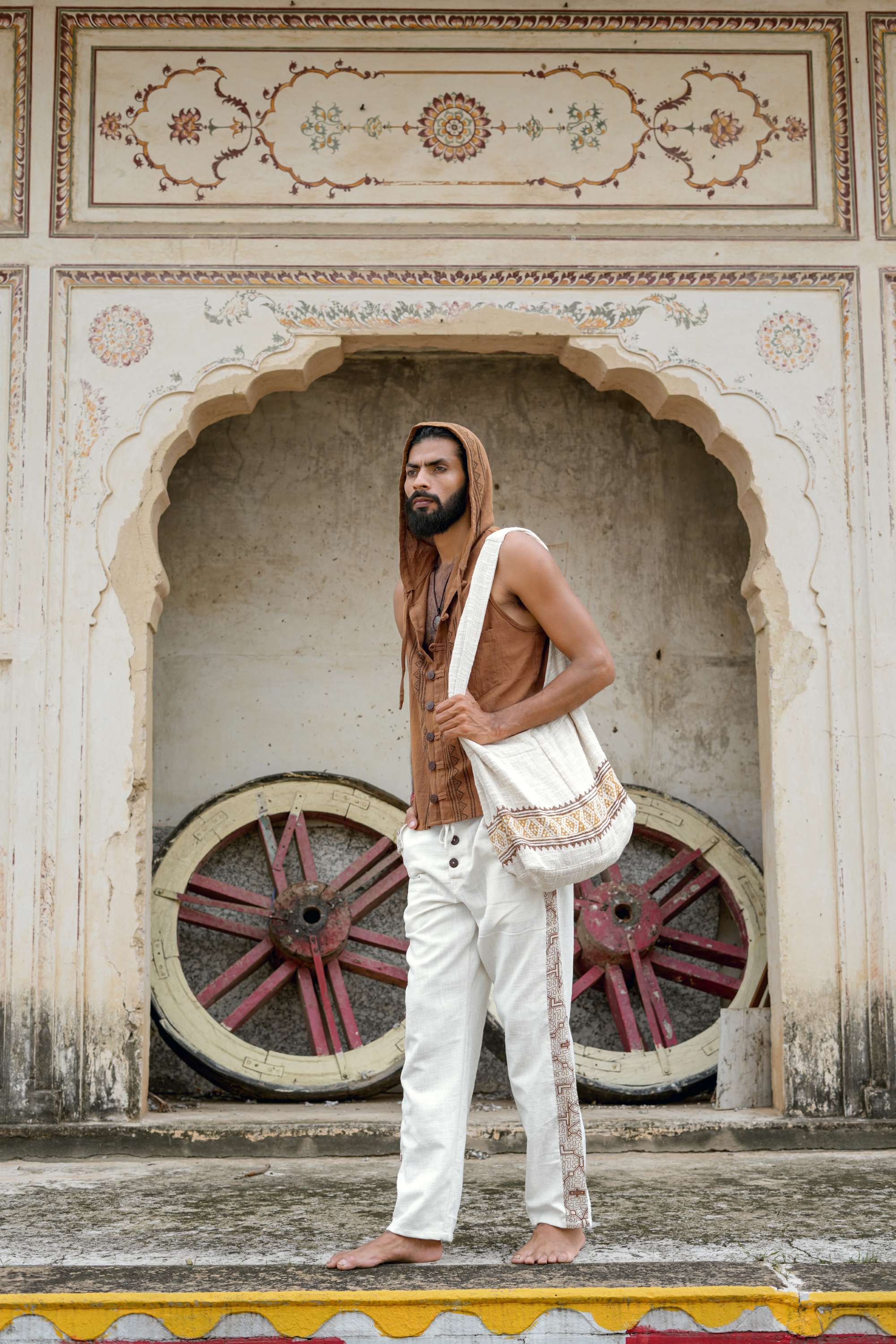 This beautiful bag is made from raw bugala cotton, offering a sturdy yet soft texture. Its striking two-tone blockprint adds a unique touch of style, making it a versatile piece for any occasion. The bag features a spacious main compartment with a handy central pocket, perfect for organizing your essentials.